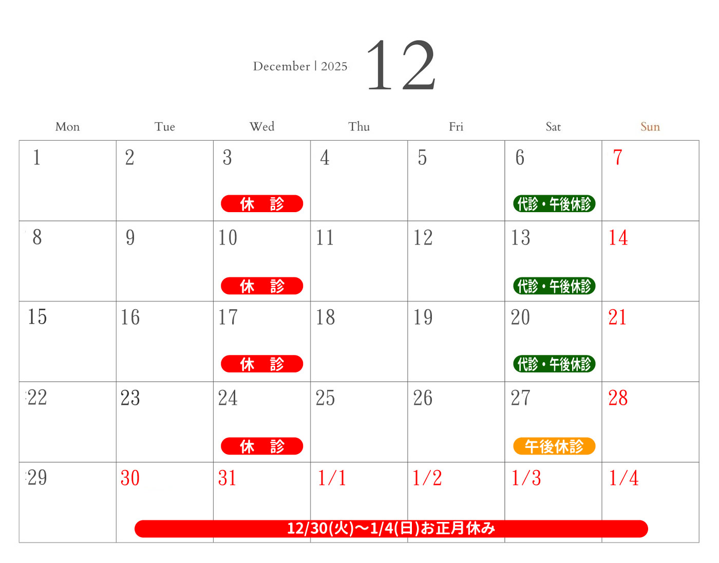※12月6日(土)・13日(土)・20日(土)は代診となります。