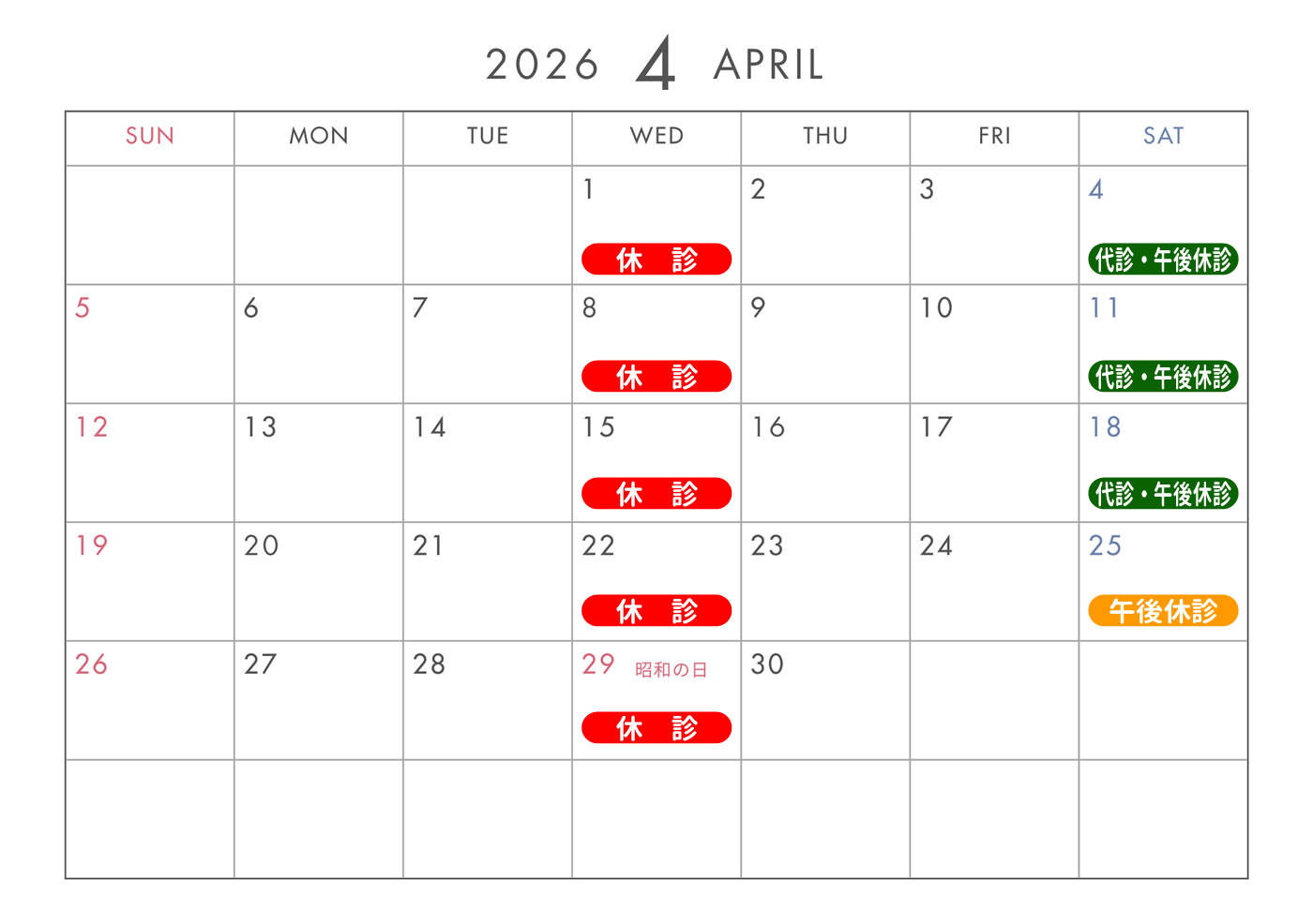 ※4月4日(土)・11日(土)・18日(土)は代診となります。
